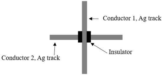 Another study done by S. Romaguera et al. [129] presents one of the earliest demonstrations of fully printed signal crossover structures using inkjet printing. The authors fabricate metal-insulator-metal (MIM) crossover architectures, (as shown in Figure 9, adapted from reference [129]) where a printed dielectric layer electrically isolates two intersecting conductive silver traces. The study focuses on process feasibility, material compatibility, and multilayer build-up using sequential deposition and curing steps. This study establishes a fundamental manufacturing framework for additive signal crossovers and highlights key challenges such as layer uniformity and registration accuracy that remain relevant to modern aerosol jet and direct-write crossover fabrication techniques.