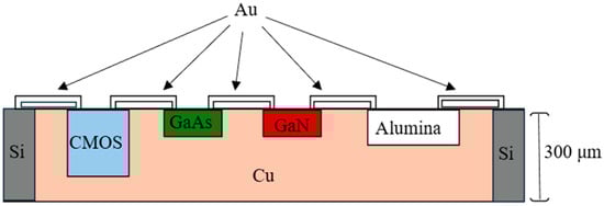 - Sato, M.; Kobayashi, Y.; Niida, Y.; Saito, K.; Kurahashi, N.; Okano, A.; Ito, Y.; Kurahashi, T.; Iijima, S.; Nakata, Y.; et al. Heterogeneous Integration of Microwave GaN Power Amplifiers with Si Matching Circuits. IEEE Trans. Semicond. Manuf. 2017, 30, 450–455. [Google Scholar] [CrossRef]