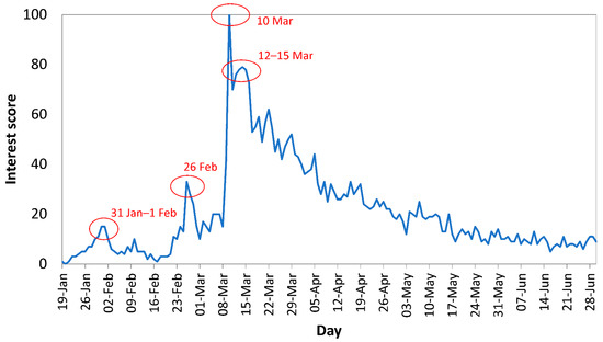 Knowing what is popular among the public can help health authorities monitor information spread that could be associated with disease transmission, progression, and control. Google Trends (GT) is a very popular, free online tool that provides information on public interest in various topics [1]. Several studies [1,2,3,4] have focused on public interest using data from GT and found a relationship between GT and health data, including those on Coronavirus Disease 2019 (COVID-19). For instance, Liu et al. [2] analyzed the United States (US) audience’s GT data and showed that when high profile figures endorsed the therapeutic use of chloroquine and hydroxychloroquine for COVID-19, the relative search queries for buying these products increased. Another research group [4] studied GT data until late February 2020 from US, United Kingdom (UK), Australia, Canada, New Zealand, and Ireland showing that the peak of interest in COVID-19 was on 31 January 2020 in all countries. However, the speed of interest growth, the response time, and the duration of public attention differed across them.