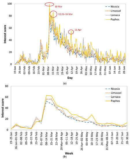 Figure 2. (a) Interest Score trend and (b) weekly average of Interest Score over the time period 19 January to 30 June 2020 across Nicosia, Limassol, Larnaca, and Paphos, based on the search query Coronavirus.