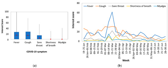 Figure 3a shows IS quartiles of five symptoms of COVID-19 (fever, cough, sore throat, shortness of breath, and myalgia). Overall, the main symptoms of interest were cough and fever. Although the trend of weekly average of IS (Figure 3b) showed differences between symptoms, the IS of all symptoms increased around 8 March to 21 March 2020. A second peak of IS was found for fever in 12–18 April 2020 and 10–16 May 2020, and for cough in 5–11 April 2020.