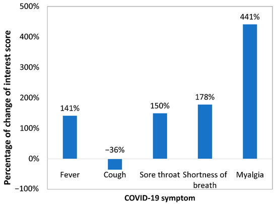 The popularity of symptoms changed before and after the announcement of the first COVID-19 case in Cyprus (9 March 2020) [14]. This change was higher for sore throat, shortness of breath, and myalgia, which had a 150%, 178%, and 441% increase, respectively (Figure 4).