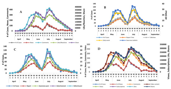Figure 2 shows various models, i.e., web resources of four websites, activities on YouTube, TV news channels broadcasting activities, daily newspaper campaigns, news coverage on internet resources (YouTube and websites), and electronic and print (TV channels and newspapers) media coverage. As soon as the reports populated the print, electronic, and social media, civil society started their response on various outlets. Different proportions of masses used various news resources and some people used multiple information resources at the same time. The electronic and print (EP) media line is closest to actual cases.