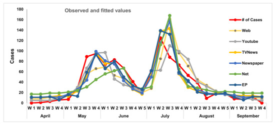 AIC of a log-likelihood model is penalized for a number of covariates. Its lower value suggests a “better” model, but it is a relative measure of model fitness. On the basis of AIC, the electronic and print (EP) media model is the best fit (Table 2) following the news channels model. Internet resources model is the worst fit among the models given in Table 2 with AIC 527. These results are presented in the data over 26 weeks (outbreak period). A large dataset may compute better results. The AIC allows comparisons of different models estimated on the same dataset (26 weeks) with various choices of the set of covariates (e.g., news, shares, likes etc.).