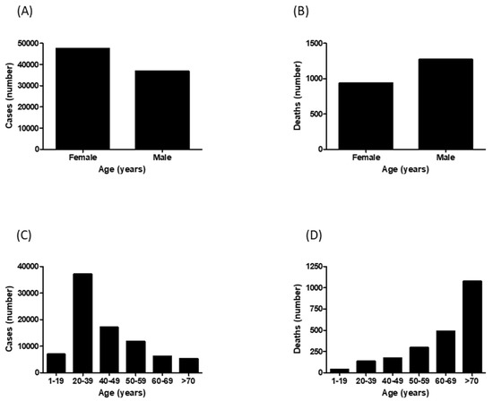 Demographic data of COVID-19 in the state of Sergipe (Brazil) from April to October 2020. (A) Distribution of cases between male and female. (B) Distribution of deaths between male and female. (C) Distribution of cases between different age ranges. (D) Distribution of deaths between different age ranges.
