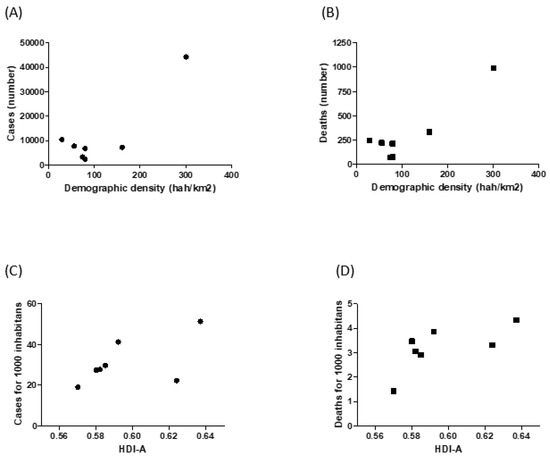 Cumulative data about COVID-19 by health regions of the State of Sergipe, Brazil, from April to October 2020. (A) Relationship between demographic density and confirmed COVID-19 cases; (B) relationship between demographic density and deaths by COVID-19; (C) relationship between COVID-19 case incidence and Human Development Index—average (HDI-A); (D) relationship between COVID-19 death incidence and Human Development Index—average (HDI-A).
