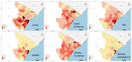 COVID-19 territorial distribution in the State of Sergipe, Brazil, from April to October 2020. Case number, case incidence per 1000 inhabitants, HDI, death number, death incidence per 1000 inhabitants and density (inhabitants/km2).