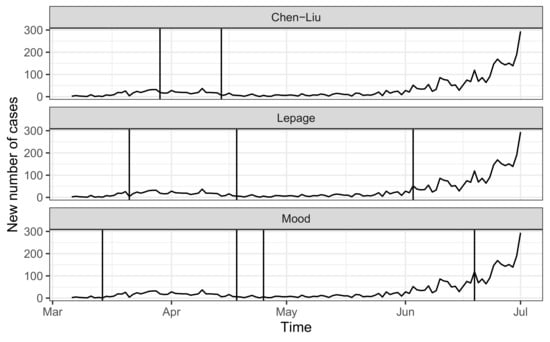 Using the change-point for sequential multiple change detection, we detected significant points with the non-parametric Mood [] and Lepage [] tests using the series of log-differences of newly infected cases as a way to quantify the rate of change of the overall series. Figure 1 shows the series of new infected COVID-19 cases with the estimated change-points with the available methodologies.