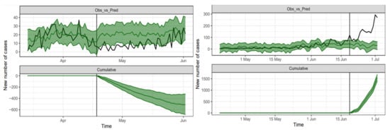 The upper-right panel in Figure 2 shows the fitting with 19 April 2020 through 19 June 2020 as pre-intervention period and 20 June 2020 through 2 July 2020 as post-intervention period. In this case, the effect is the opposite. There is a mean cumulative difference between observed and estimated cases of 1965 cases on 2 July 2020. This represents 48.8% of the observed cumulative cases on the same date. The daily difference among the observed and the expected number of cases (under the pre-intervention conditions) is between 109 and 131 cases with the same confidence level, with a mean difference of 120 cases. In relative terms, there is a mean increase of 387% in the number of daily cases with a confidence interval of (351%, 423%) approximately.