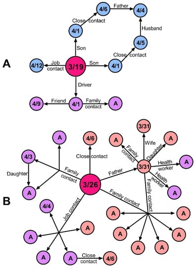 Transmission chains of the first two imported cases of COVID-19 in Amazonas, Peru. (A) Imported case of a policeman traveling from Lambayeque to Bagua. (B) Imported case of a lawyer traveling from San Martin to Bagua. Circles represent individuals. Arrows represent the direction of transmission. Sky blue, purple, and pink represent Bagua, Chachapoyas, and Bongara cases, respectively. Fuchsia color represents the primary imported case. Information in circles shows the date of symptoms onset. A, asymptomatic.