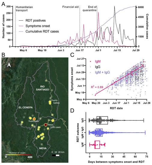 Origin and spread of COVID-19 cases in Condorcanqui. (A) Number of RDT-positive cases from May to July 2020 in black alongside onset of symptoms in pink. Humanitarian transport of residents back to Amazonas started in 30 April; the end of the national quarantine was on 30 June. (B) Cumulative number of cases of COVID-19 in localities of Condorcanqui province until 29 June. The city of Nieva and 48 local native communities from the three districts of Condorcanqui had confirmed cases of COVID-19. Nieva district had the highest incidence with the capital Santa Maria de Nieva reporting 1199 cases until 29 June. (C) Distribution of RDT-positive cases in Condorcanqui. Linear regression for IgM-positive cases is shown. (D) Box and whiskers plot of the time elapsed between the reported symptoms and the diagnosis by RDT.