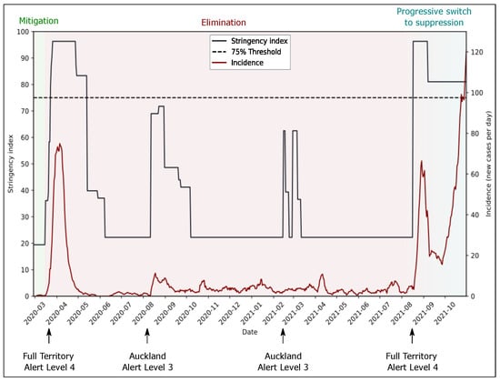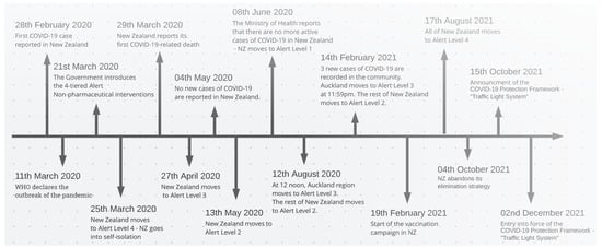 - History of the COVID-19 Alert System. Available online: https://covid19.govt.nz/about-our-COVID-19-response/history-of-the-COVID-19-alert-system/ (accessed on 30 November 2021).