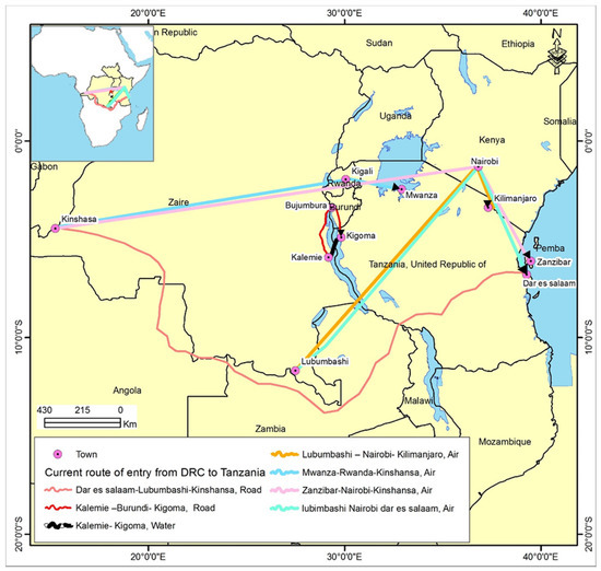 Tanzania is one of the countries in the Great Lakes Region of Africa located between latitude 6°22′22.17″ S and longitude 34°53′32.94″ E. Neighboring countries include Burundi, the Democratic Republic of the Congo, Kenya, Malawi, Mozambique, Rwanda, Uganda, and Zambia. It has 59,734,218 people with an estimated growth rate of 3.0% [28]. One of its regions, namely Kigoma, located in the west, shares its land border with Burundi and DRC. Dar es Salaam has an international airport and seaport, through which most of the passengers from DRC import and export goods. The regional health system operates in a decentralized organization with public and private health service delivery [29]. Tanzania has about 42 ports of entry responsible for overseeing the implementation of International Health Regulations [30].