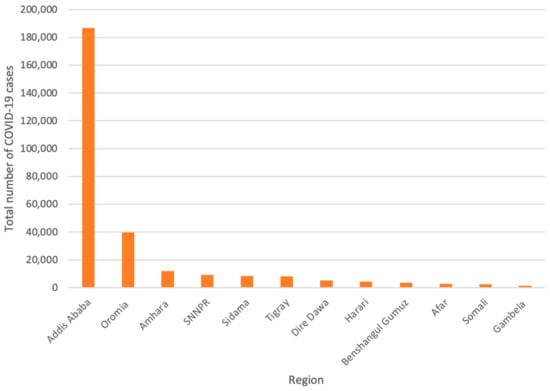 Confirmed COVID-19 cases across Ethiopia’s regions [] Adapted from Ethiopian Public Health Institute. Covid 19—Ethiopian Public Health Institute. 2021. Available online: https://ephi.gov.et/ (accessed on 17 March 2022).