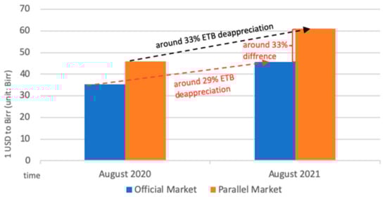 Official and parallel market exchange rate of United States Dollar (USD) to Birr. Adapted from WFP. Monthly Market Watch Ethiopia|August 2021; World Food Programme: Addis Ababa, Ethiopia, 2021.