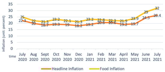 Headline and food inflation in Ethiopia. Adapted from: Anon (n.d.). Ethiopia Food Inflation|2021 Data|2022 Forecast|2013–2020 Historical|Chart. Available online: https://tradingeconomics.com/ethiopia/food-inflation.