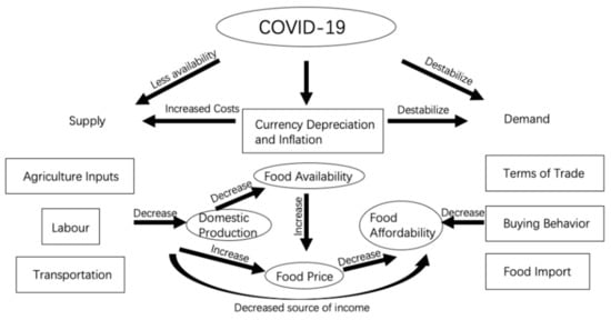 The Constitution of the WHO states that “Health is a state of complete physical, mental and social well-being and not merely the absence of disease or infirmity” []. Food security is closely linked with the well-being of people. Food security is achieved when all people always have physical and economic access to sufficient, safe, and nutritious food that meets their dietary needs and food preferences for an active and healthy life []. The COVID-19 pandemic has had a significant impact on global food security. It has triggered a recession comparable to that seen after World War II, causing losses in income and disruptions in food supply chains []. Naturally, these occurrences affect poor people’s food security more than that of richer people because there is already an imbalance of income and access. People with less tangible income must adjust food choices accordingly, and this effect is stronger with the fewer-income families. Research done by Laborde et al. predicts that for every percentage point of global economic slowdown caused by the pandemic, the number of people living in poverty would increase by 2% to 3% worldwide []. The number of people in extreme poverty would then increase by over 140 million, in the absence of effective interventions. This increase in poverty not only reduces access to food but also causes a decline in nutrition and quality of diet [].