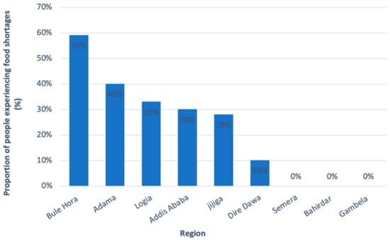 Despite the resilience of Addis Ababa’s food security, households with a lower wealth status, and households in urban areas outside of Addis Ababa, faced a greater risk of food insecurity resulting from COVID-19. This risk is reflected in a study assessing vulnerable households in nine different urban areas of Ethiopia since the start of the pandemic. Within these vulnerable groups, 27% of beneficiaries of the UPSNP, despite receiving assistance, reported having experienced food shortages. Increased food prices, devaluation of the Ethiopian Birr, and an already low income following the pandemic were cited as factors leading to food insecurity. Workers in the informal sector, daily wage earners, daytime laborers, street vendors, and women were amongst the most vulnerable to income loss and hence food insecurity []. In addition, food shortages were reportedly more severe in smaller cities such as Bule Hora and Adama (Figure 7). Nonetheless, the study has found that as the pandemic progressed, food security began to recover back to pre-COVID-19 levels. This suggests that even among the most vulnerable groups in urban areas, COVID-19-related food insecurities were just a temporary shock as opposed to a more permanent issue [].
