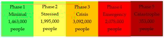 Integrated food security phase classification (IPC) of the 9 million people analyzed in northern Ethiopia. Adapted from IPC. Ethiopia: Acute Food Insecurity Situation May–June 2021 and Projection for July–September 2021. 2021. Available online: https://www.ipcinfo.org/ipc-country-analysis/details-map/en/c/1154897/ (accessed on 17 March 2022) [].