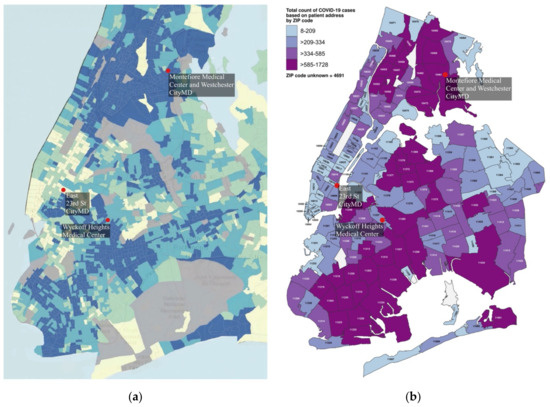 - NYC Gov. Total count of COVID-19 cases based on patient address by ZIP code, April 8 2020. NYC Health COVID-19 Data Archive. 8 April 2020. Available online: https://www1.nyc.gov/assets/doh/downloads/pdf/imm/covid-19-cases-by-zip-04082020-1.pdf (accessed on 23 July 2022).