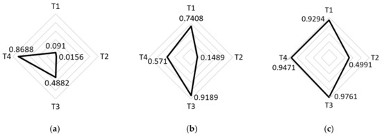 SVI by theme where T1 is socioeconomic status, T2 is household composition and disability, T3 is minority status and language, and T4 is housing type and transportation [7]: (a) Manhattan, Tract 64, SVI = 0.2083; (b) Brooklyn, Tract 443, SVI = 0.6854; (c) Bronx, Tract 200, SVI = 0.9610. # = number.