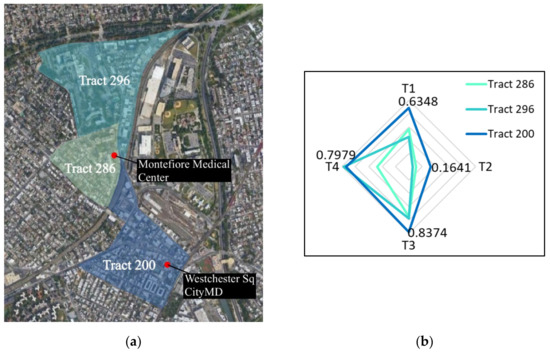 Community characteristics around Montefiore Medical Center: (a) satellite image overlain by tract boundaries and their population for tri-partite population areas surrounding Montefiore Medical Center; (b) visualized weighted SVI for areas in 3a, where T1 is socioeconomic status, T2 is household composition and disability, T3 is minority status and language, and T4 is housing type and transportation.