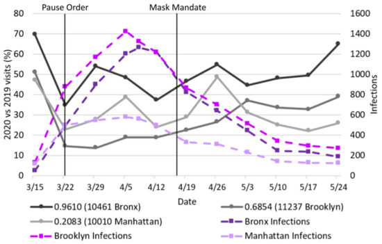 Many studies have associated socioeconomic vulnerability with higher rates of COVID-19 and greater mobility in the early weeks of the pandemic (often using POI visits as a proxy). For example, in a study of 38,000 POIs in Los Angeles, census block groups with higher SVIs (typically between 0.5 and 0.75) had both greater mobility and higher COVID-19 infection rates, although the authors did not provide specific quantitative cut-offs in their “low”, “medium”, and “high” classifications [33]. In a study of POIs across all of NYC, in the early weeks of the 2020 PAUSE order, higher SVI levels and greater mobility levels were initially associated with larger community COVID-19 positivity rates, but those correlations rapidly declined by the end of the PAUSE order’s sixth week [34]. In an aggregate study of POIs across the United States’ ten largest metropolitan areas, higher infection rates were present among more socioeconomically disadvantaged areas, which was attributed to differences in mobility levels [35]. Additionally, those authors simulated the potential positive impact that capping POI occupancy to pre-pandemic levels would have in reducing the spread of COVID-19 [35]; however, there was no consideration of the actual POI visit levels compared with those of the previous year or the real 2020 visit levels and their potential correlations with actual neighborhood infection rates. Although POI visits do not capture the entirety of a community’s population, they have been used as a reliable proxy for mobility (as shown above), and Safegraph estimates that their data collection represents 20% of all cellphone usage in the State of New York.