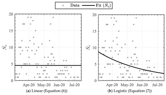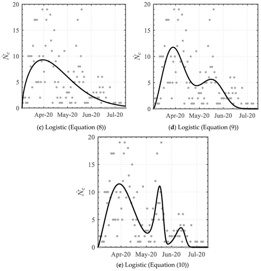 In relation to the cumulative infected cases, a daily infected case trendline analysis was undertaken by implementing the arithmetic time-derivative of the cumulative functions (Equations (6)–(10)).