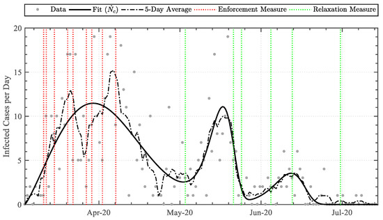 Comparison between the derived trendline fit (Equation (10)) and the 5-day average, together with the intervention enforcement/relaxation dates.