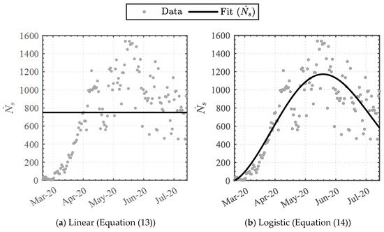 Applying Equations (11) and (12) to the cumulative swab dataset attained the data-driven variables detailed in Table 4. The linear function attained the least similarity, whereas the Weibull-based logistic function attained the highest similarity, with coefficients of determination () of 0.901 and 0.999, respectively. The functions were graphically superimposed upon the dataset, as illustrated in Figure 4.