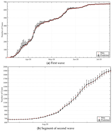 The forecasting model was applied for the entire first wave (7 March–15 July 2020), and a portion of the second wave (16 July–31 August 2020), to establish the continuity capacity of the model. Employed within a one-day (Figure 7) to a five-day (Figure A1, Figure A2, Figure A3, Figure A4, Figure A5, Figure A6, Figure A7 and Figure A8) prediction framework, the statistical model attained good agreement with the dataset, achieving a global coefficient of determination () of 0.9995 to 0.9955 between the statistical model median outputs and the actual dataset. Good agreement was also attained for predictions beyond five days. Particularly for the one-day, two-day, and three-day forecasting, solely 4.5%, 7.8%, and 12.3% of the data-points fell outside of the 0th–95th percentile prediction band, respectively. The explicit statistical modelling methodology was therefore deemed to have been validated to a high degree of accuracy.
