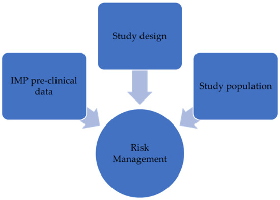 As shown in Figure 1, the risk management system should evaluate the crucial elements when performing a clinical trial: IMP pre-clinical data, study design, and study population. These categories should be monitored during clinical development, and clinical trial features should be re-evaluated when new information related to the IMP becomes available through a risk assessment [16].