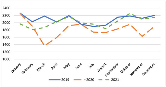 The length of stay (LOS) is the cumulative time a patient spends in an ED. Table 2 presents the LOS for patients who accessed an ED during the three reference years, 2019, 2020, and 2021. An increased LOS was observed for both discharged patients (9.0 vs. 10.1 vs. 11.2 h, respectively; p value < 0.005) and for hospitalized patients (7.5 vs. 9.7 vs. 10.6 h, respectively; p value < 0.005). Overall, data indicate an increase in the processing time of patients in EDs for the years 2020 and 2021 compared to 2019.