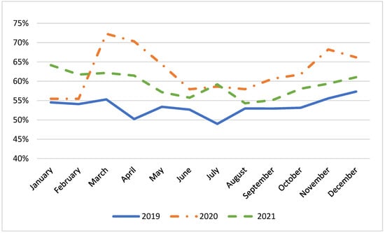 Figure 2 depicts the number of patients with stroke and stroke-like syndromes who arrived at EDs via the EMS system. The monthly average increased from 53% in 2019 to 63% in 2020 and 59% in 2021 (p < 0.0001). The percentage peaked at 72% during the first wave. Additional increases were observed during the second (68%) and third (64%) waves.