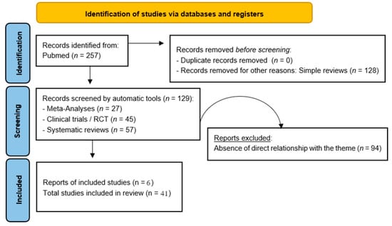From January 1991 to June 2024, we actively searched PubMed for systematic reviews, meta-analyses, clinical trials, and randomized controlled trials using “Addiction AND Video games”, selecting 257 eligible results, 35 of which were included by removing duplicate content, irrelevant items, and absence of search items. To get a broader and more complete overview of the topic, 6 more references were added (from elsewhere and not the Pubmed platform, being materials from the academic literature), for a total of 41 results. Simple reviews, opinion contributions, or publications in popular volumes were excluded as redundant or not relevant to this work. An artificial intelligence program was not used for the automatic selection of results, but the tools and services offered by the PubMed platform were used. The search was not limited to English and Italian language papers (Figure 1).
