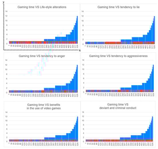 Graph of growth curves between the variable representing the daily duration of gaming time and the tendency to lie, feel anger, show aggression, perceive benefits from gaming activity, and engage in deviant and criminal behavior. The X-axis shows all study participants according to an increasing scale of severity (concerning the number of hours devoted to playful activity with video games; the more hours devoted, the more severe the need to use video games as an addictive tool), while the Y-axis shows hours of video game use. The subjects in the clinical group are in blue, while the subjects in the control group are in red.