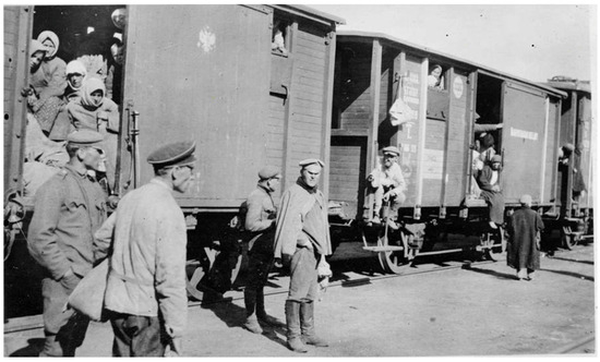 Original caption: “Freight trains crammed with refugees returning to their homes in Poland after having passed through the delousing and disinfecting stations on the eastern border” [39]. 11 October 1919.
