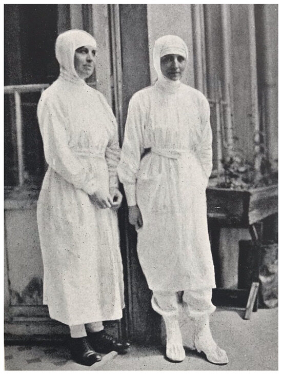 The delousing protocol performed by the LRCS team at St. Stanislaus Hospital was quite laborious. In the delousing room, the patient was stripped of clothing before being transferred to a table. The clothing was conveyed to a steam sterilizer. On the table, all hair thick enough to conceal lice or their eggs was clipped to below the egg-bearing length, and the clippings were either boiled or burned. The body, except the scalp, was bathed with soap and water. Soap and water do not kill lice; they only facilitate mechanical removal, and if the clipping had not been meticulously conducted, viable lice and their eggs may remain amongst the hairs. After the bathing and drying, the scalp, axillae, and pubic and anal regions were doused with kerosene or a light oil, and the same was rubbed lightly over the whole body. The patient was then transferred to a clean stretcher, given a head-cap and night shirt, and taken to bed. The table and floor of the delousing room were cleaned with kerosene cloths and mopped after each patient. The delousing of each patient was performed by two nurses or orderlies; ideally, these were persons who are typhus-immune by virtue of prior infection, and they wore louse-proof gowns (sterilized by steam or naphthalene after each use) and rubber gloves (Figure 7) [69,70].
