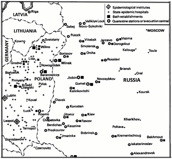 Typhus infiltrated neighboring Slovakia in 1919–1920, resulting in over 1300 cases and 160 deaths [52]. The German border was breached by typhus as well, due to the flux of repatriating German civilians, 150,000 returning prisoners of war, and the outward migration of Russian prisoners of war. By March 1919, there were over a thousand cases in Prussia, with hundreds of deaths. Furthermore, after the 1918 armistice the German army relinquished its Ukrainian territories, precipitating the migration of 120,000 Germans and Jewish refugees through typhus-ridden lands on their westward trek to Germany. In 1920, German public health authorities instituted a cordon sanitaire on its eastern border, which included a chain of bacteriological stations and a hygiene institute in each major city [7]. The German Interior Ministry favored cooperation with Poland and its other neighbors in the anti-typhus campaign. However, the French government opposed any German presence in Poland [19]. German participation in matters of transnational health was obstructed in the early post-war era by its continuing pariah status. Even though typhus raged on its borders for over 3 years, Germany was not invited to participate in an international health conference until 1922 and it was denied admission to the LoN until 1926. Scientists at the various Pasteur Institutes declined to collaborate with their German counterparts [53]. In turn, German scientists also isolated themselves from their European colleagues due to their own resentments [7,19].