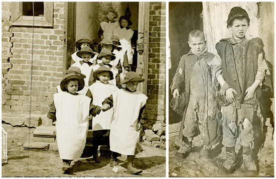 - American Jewish Joint Distribution Committee. Children Wearing Makeshift Coats from Flour Sacks Outside an Orphanage in Grodno, Poland. Available online: https://www.wdl.org/en/item/17327/ (accessed on 19 October 2021).