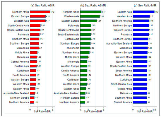 Region-wise sex ratio of TBL cancer burden in 2022. ASIR: Age-standardized Incidence Rate; ASMR: Age-standardized Mortality Rate; MIR: Mortality-to-incidence ratio. MIR was calculated as the ratio of ASMR and ASIR. Source: Authors’ calculations using data from GLOBOCAN 2022. Available online: https://gco.iarc.fr/today/online-analysis-table, accessed on 30 October 2024.