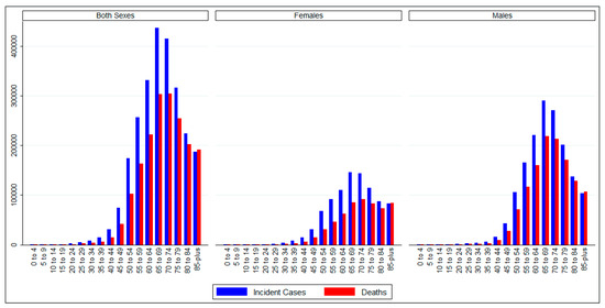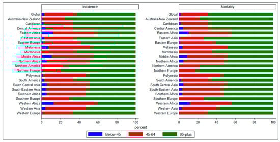 To further explore age-wise distributions in the regions, we grouped age-wise incident cases and death counts into three age groups: below 45 years, 45–65 years, and above 65 years at the regional levels and computed deaths and incident cases occurring in these three broad age-groups (Figure 3). It shows that at the global level, nearly 60% of incident cases and nearly 65% of deaths occurred in those above the age of 65 years. In most regions, a very small percentage of incident cases and deaths occurred in below-45 years age groups. In African regions, a significant percentage of TBL cancers occurred in younger age groups. Cumulatively, below-65 age groups accounted for 55–60% of incident cases and deaths in African regions, whereas in regions of Europe, 65–70% of incident cases and deaths occurred in those above 65 years of age.