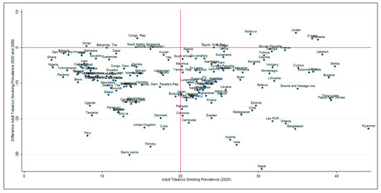 Country-wise adult tobacco smoking prevalence in 2000 and 2020. The vertical axis shows the difference between adult tobacco use prevalence (%) between the years 2020 and 2000. The horizontal axis shows adult tobacco use prevalence in 2020. Data source: World Development Indicators Database of World Bank.