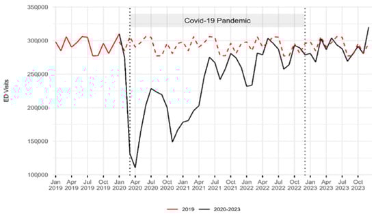 Emergency department visit volume trends: 2019–2023. The red dashed line indicates the 2019 baseline for comparison with the period from 2020 to 2023. Two vertical dashed lines represent the onset of the COVID-19 pandemic in March 2020 and its end in December 2022. A sharp decline in the number of ED visits was observed during the first year of the pandemic, followed by a gradual return to pre-pandemic levels.