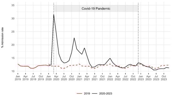 Hospital admission rates in the emergency department: 2019–2023. The red dashed line indicates the 2019 baseline for comparison with the period from 2020 to 2023. Two vertical dashed lines represent the onset of the COVID-19 pandemic in March 2020 and its end in December 2022. An increase in the hospital admission rate was observed during the first two years of the pandemic, with levels in 2023 remaining slightly below pre-pandemic values.