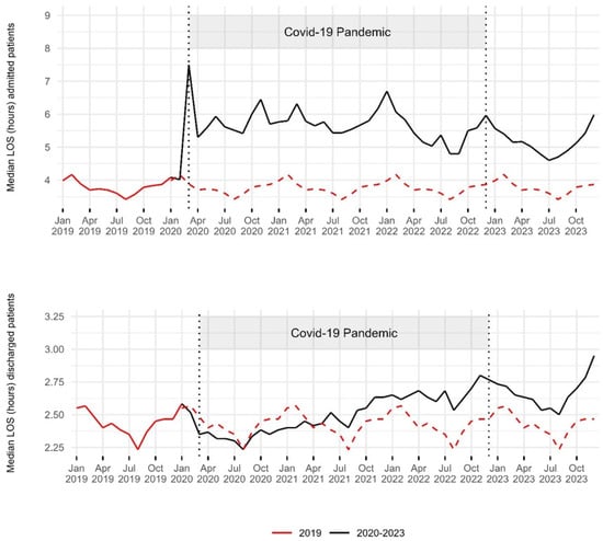 Trends in median ED length of stay of admitted and discharged patients: 2019–2023. The red dashed line indicates the 2019 baseline for comparison with the period from 2020 to 2023. Two vertical dashed lines represent the onset of the COVID-19 pandemic in March 2020 and its end in December 2022. The median EDLOS of admitted patients increased notably since the beginning of the pandemic, remaining above pre-pandemic values throughout 2023. The median EDLOS of discharged patients decreased during the first year of the pandemic, then remained above pre-pandemic values, even in 2023.