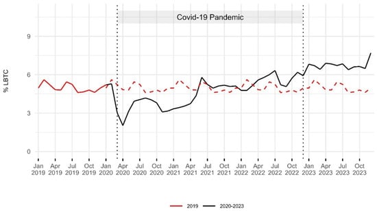 Trends in the rates of leaving the emergency department before treatment completion: 2019–2023. The red dashed line indicates the 2019 baseline for comparison with the period from 2020 to 2023. Two vertical dashed lines represent the onset of the COVID-19 pandemic in March 2020 and its end in December 2022. Rates of LBTC decreased during the first year of the pandemic, then gradually increased, reaching the highest levels in 2023.