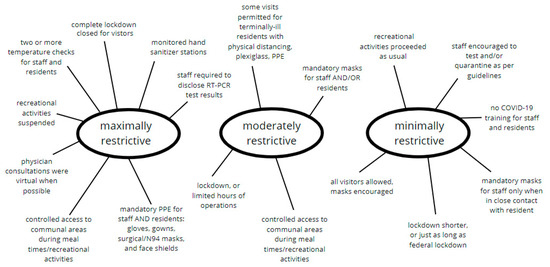 In vivo codes formed an analytic narrative that represented three themes: maximally restrictive, moderately restrictive, and minimally restrictive. The classification of NPIs underwent a rapid validation process through face validity assessment by two study authors (L.K.M. and O.K.), both of whom have high expertise in public health and clinical practice. This ensured that the classification was systematically applied across all nursing homes despite variations in implementation. Non-pharmaceutical interventions in nursing homes were classified as maximally restrictive if they involved a combination of the following: complete lockdown, multiple daily screening strategies (temperature check, antigen or RT-PCR test, mandatory PPE, hand hygiene), restricted access to communal areas, and/or closed for visitations. Moderately restrictive measures included limited hours of operations, some daily screening strategies (temperature check, obligatory mask, hand hygiene), and controlled access to communal areas. Nursing homes that generally allowed their residents and staff to autonomously adopt anti-COVID-19 measures were classified under the ‘minimally restrictive’ thematic umbrella. Figure 1 displays the final thematic map created for this data set.