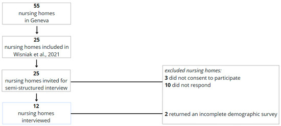 Of the 55 established nursing homes in Geneva, 25 were included in the previous SEROCoV-WORK study and had staff seroprevalence data available [3]. Of these, we interviewed 12, and analyzed the demographics of 10 (Figure 2).