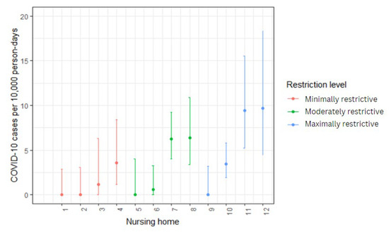 Of the 12 nursing homes interviewed, we observed an equivalent, one-third, distribution of maximally restrictive, moderately restrictive, and minimally restrictive NPIs. To assess if these themes are associated with more or less infection, we compared the three levels of COVID-19-related measures taken in these nursing homes, and the cumulative incidence of PCR-confirmed COVID-19 cases in their resident population (Figure 3). The incidence rate ratios (IRRs) for moderately and maximally restrictive measures were estimated to be 3.55 and 3.90, respectively, when compared to minimally restrictive NPIs as a reference (Table 1). These associations were not statistically significant.